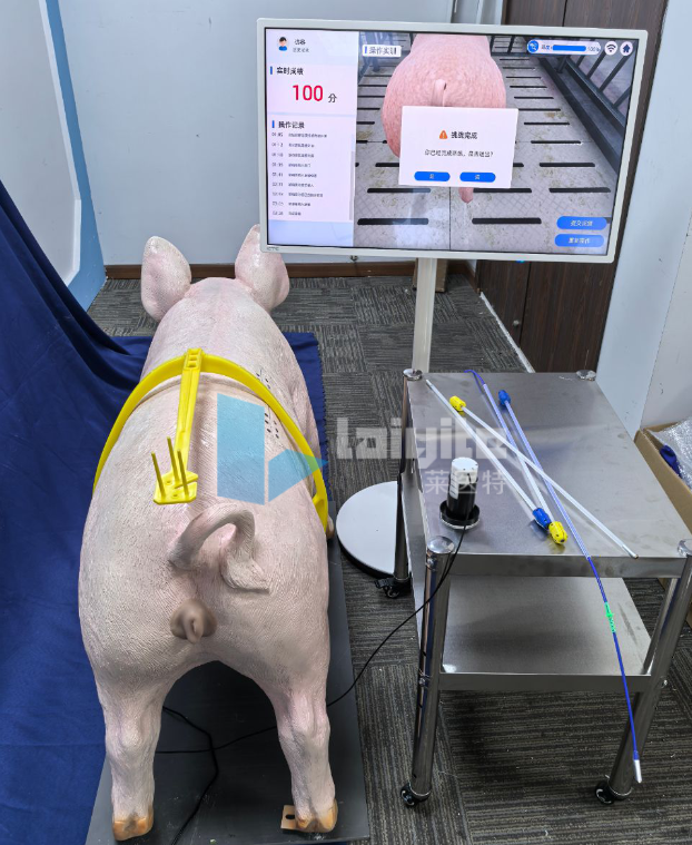 猪人工授精智能实训设备(整猪版)是一套用于母猪发情期鉴定、母猪人工授精操作的虚实结合教学、训练设备。产品支持母猪发情鉴定虚实结合操作、母猪常规输精虚实结合操作、母猪深部输精虚实结合操作。系统配有1:1的母猪实体模型一只和仿真输精工具一套,系统可以检测压背位置、抚摸与擦拭区域是否准确,输精管具备角度、插入深度检测功能,可以与仿真精液瓶连接,可记录输精量、输精时间。学生对母猪实体模型进行操作时,可触发仿真实训软件做出相对应的反馈和交互,并提供语音与动画指导,同时系统可以对实操过程实时监测,并进行同步评分,操作完成后立即生成实验报告,可以有效提高学生的学习效率。